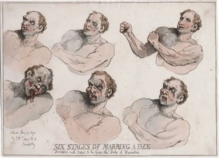 Шесть стадий изменения физиономии бойца во время поединка. Рисунок 1792 г.