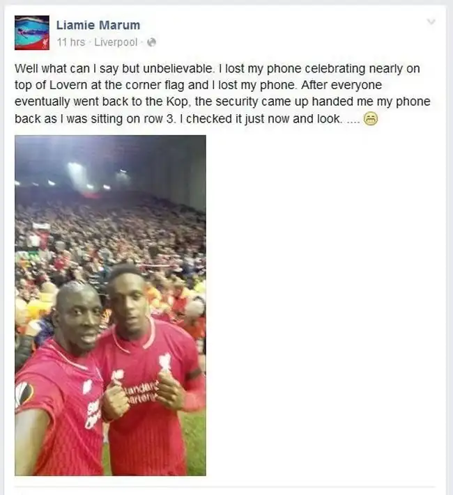 Звучит невероятно! Я потерял свой телефон, празднуя гол почти на краю трибуны, что находилась у углового флажка, куда побежал отмечать свой гол Ловрен. После всего этого мы вернулись к КОП'у, охранник подошел ко мне и вернул мой телефон. Я стал его проверять и увидел это: