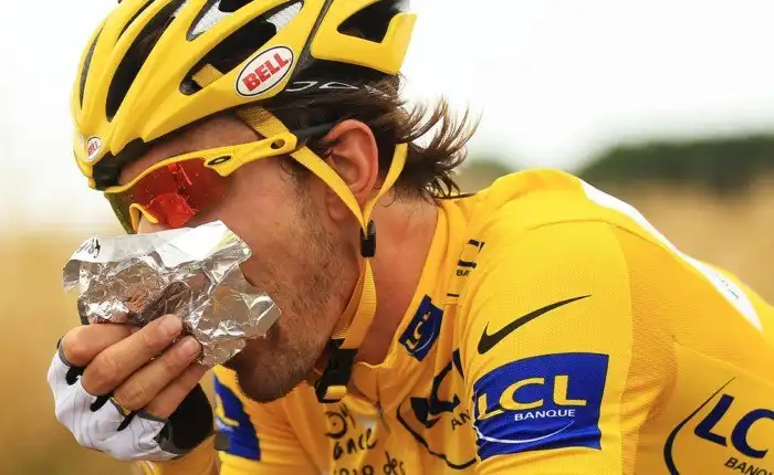 Во время гонки человек сжигает от 6000 до 8000 калорий. К таким экстремальным затратам также готовятся заранее. Собственно, вся жизнь профессионального велогонщика строго подчинена диете — любая поблажка вполне может стоить победы. Завтрак обязательно должен быть насыщен протеинами, так тело легче справляется с нагрузками, а голод наступает около 15:00 дня, во время следующего приема пищи. Всего гонщик ест четыре раза: завтрак, быстрый ланч на тренировке (не слезая с велосипеда), обед и ужин. На самой Тур де Франс прибавляются еще два приема еды, во время гонки и сразу после нее.