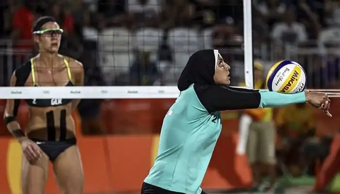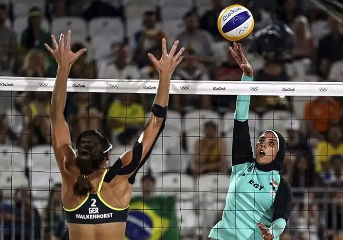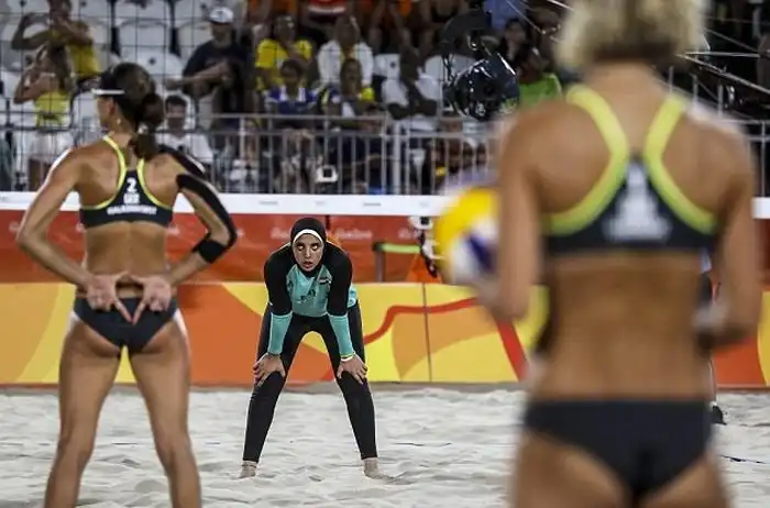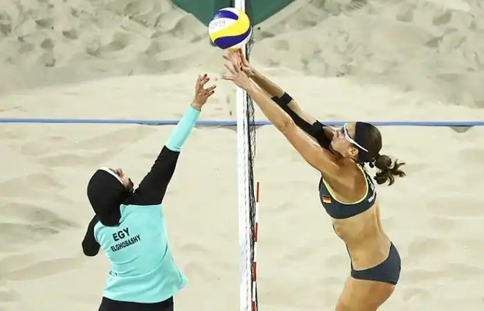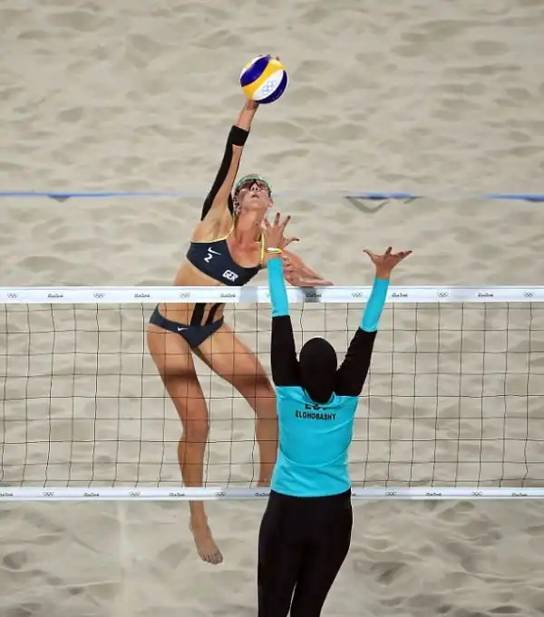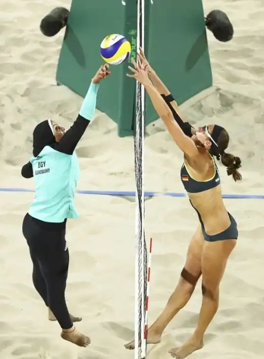 Огромная разница в культуре и религии европейцев и жителей мусульманских стран проявляется даже на Олимпийских играх. Перед вами фото, сделанные во время состязаний по пляжному волейболу. Командам из Германии и Египта предстоит выяснить, кто из них сильнее, объяснять кто из девушек, за какую страну выступает, смысла нет, ведь все и так понятно.