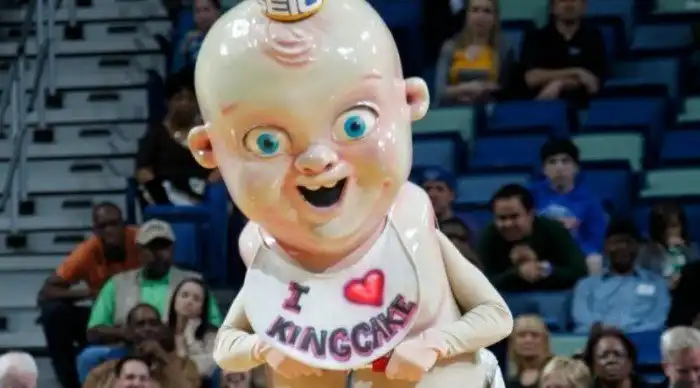 Это чудовище с глазами-плошками - талисман баскетбольной команды "Пеликаны" из Нового Орлеана. Хотя более уместным оно было бы в фильмах ужасов. И хотя на его слюнявчике написано "Я люблю кинг кейк" (традиционный кекс из кухни юга США), но, кажется, он вот-вот начнет жрать зрителей.