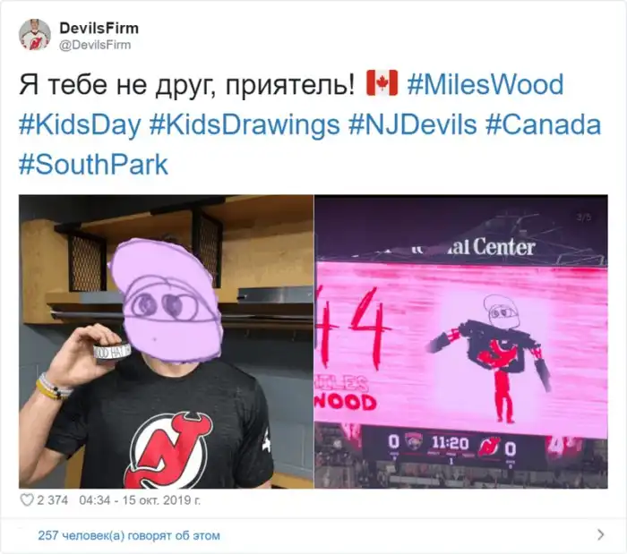 Матч между двумя хоккейными клубами New Jersey Devils и Florida Panthers запомнится зрителям не проигрышем «Дьяволов», а необычным объявлением игроков. В честь «Дня детей» маленькие фанаты нарисовали портреты игроков команды Devils, а потом эти рисунки использовались во время матча 14 октября во время представления игроков на больших экранах. Кроме того, на детей заменили исполнителя национального гимна, а также репортёра, который брал у хоккеистов интервью перед матчем.