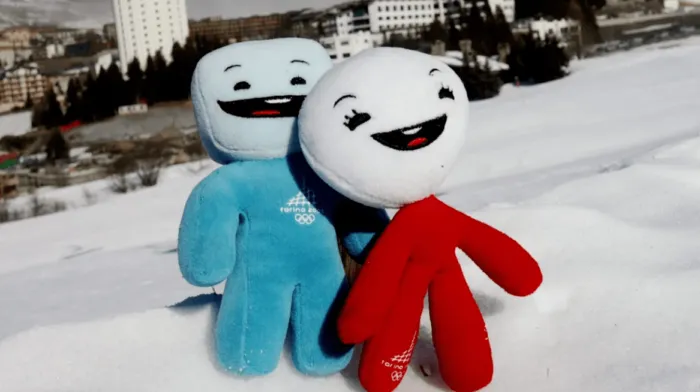Синее создание зовут Неле, он снежок. А красое — это Глиц, и она льдинка. Вместе они символизируют собой зимние виды спорта.