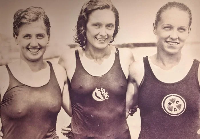 8. Призёры Олимпийских игр 1936 года по плаванию Ленор Кайт (слева) и Элис Бриджес (справа) с подругой после заплыва