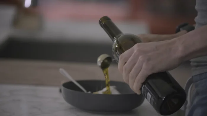 На фотографии он глушит оливковое масло. Опять.