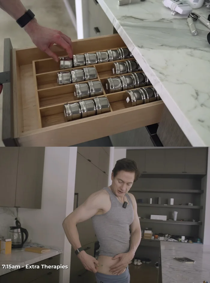 1. Анализ состава тела: Используя умные весы, я измеряю уровень жира, мышечной массы, гидратации, веса и жёсткости артерий.2. Уход за волосами: Наношу сыворотку для волос, массирую кожу головы 1–2 минуты и использую красный световой колпак в течение 6 минут.3. Медитация или дыхательные упражнения: Посвящаю 5 минут для настройки разума и тела на день.4. Первый напиток: около 240 мл смеси, включающей коллаген, креатин, пребиотики и компоненты для долголетия.