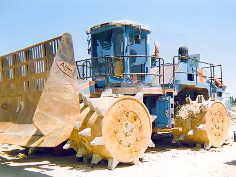 Мощные мега бульдозеры с огромными шипованными металлическими колесами для работы на свалке.