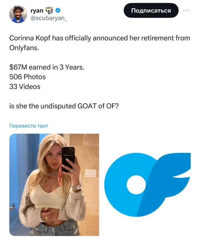 28-летняя онлифанщица пенсионерка Коринна Копф завершила карьеру — за три года усердной «работы» она заработала 67 миллионов долларов.