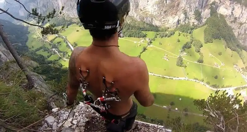 Экстримал и любитель модификаций тела Станислав Аксенов провернул трюк, от которого по коже бегут мурашки. Он прыгнул с парашютом, прицепленным к пирсингу в его спине с высоты в 400 метров. Кстати, это он же организовал прыжки со свободным падением на пирсинге.