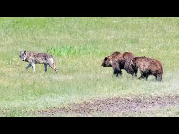 Пара гризли вежливо выпроваживают волка