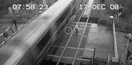Министерство транспорта Великобритании обнародовало видеозапись, на которой мужчина чуть не лишился жизни, переходя через рельсы.