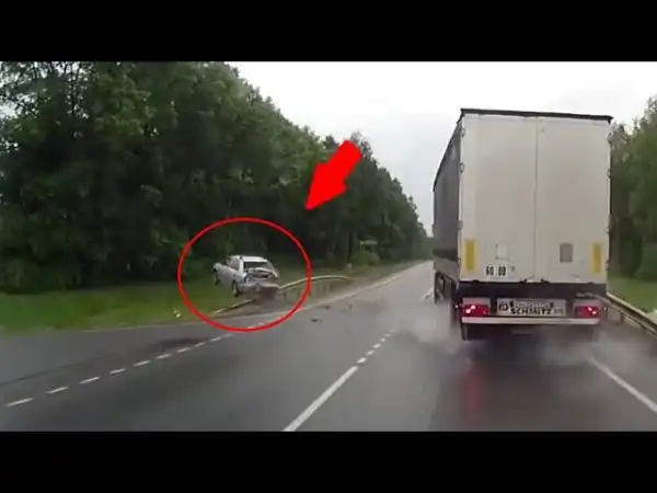 Водитель "Камаза" молодец, наверное давно за рулём. Не растерялся, не стал тормозить, а дал газ и ушёл в промежутке между машинами в поле.