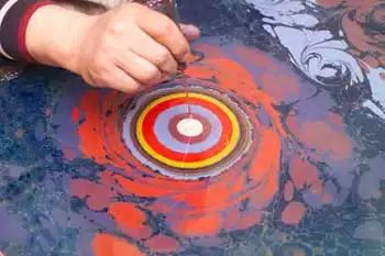 Эбру - искусство обработки бумаги, называемое «Турецким мраморированием». Вначале изображение делается на воде,а затем переносится на бумагу или ткань...Как известно, картины можно писать на совершенно разных поверхностях, от классического холста до дерева и тканей. Оказывается, существует еще и роспись по… водной глади. Искусство мраморирования бумаги - эбру - появилось в Средней Азии. Оно настолько древнее, что по сей день идут споры, где оно зародилось. По некоторым предположениям, эбру появилось в Индии, а потом было перенято персами, от которых перешло к османам, нынешним туркам. По другой версии, оно зародилось в Бухаре, и после иранцев его переняли турки. Одно можно сказать с уверенностью - эбру имеет восточные корни. На первом этапе в небольшое прямоугольное корыто выливается специально приготовленный густой раствор из воды и имеющего слабые клеящие свойства нектара гевена (это растение из рода астрагалов растет только в Турции). Таким образом достигается необходимая вязкость воды. Далее в эту смесь добавляют натуральные краски, которые не растворяются в воде, а остаются на её поверхности, смешиваются между собой и образуют причудливые и неповторимые узоры. На этот своего рода мраморный грунт мастер наносит рисунок. Он кладет на поверхность воды несколько капель краски, а потом придает каплям форму с помощью тонкой палочки. Далее на воду кладется чистый лист бумаги. Через 5-10 секунд его осторожно снимают и оставляют сохнуть. Перенесенное на бумагу произведение и является законченным "эбру". Простейший способ сотворить что-то подобное самому - поэкспериментировать с масляными красками. Для удержания красок на воде в нее можно добавить конторский клей, а масляные или печатные офсетные краски растворить в скипидаре. Далее действовать, как описано выше. Может, это будет лишь подобием эбру, зато какое удовольствие творить что-то своими руками и знать, что ваше произведение уникально и скопировать его невозможно.