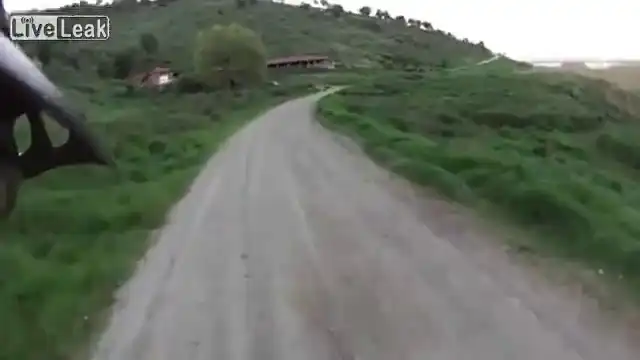 Бедного велосипедиста окружила свора разъяренных собак. Правда ему повезло: хозяин псов пришел как раз вовремя.