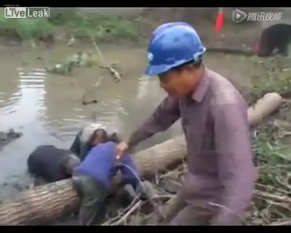 По неосторожности, свежесрубленное дерево покатилось в сторону одного из рабочих и буквально втоптало его в грязь.