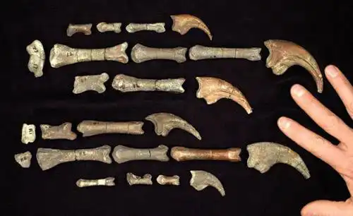 Рука человека и кисти лап древнего животного, "собранные" из окаменевших костей.