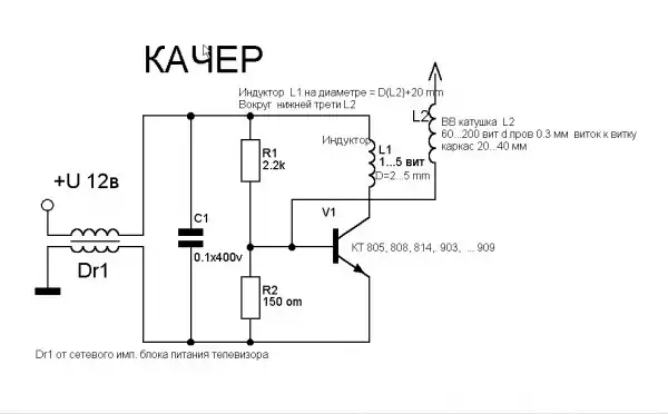 " Поскольку качеры могут управлять транзисторами малой и большой мощности, причем на значительной дистанции, то это годится для робототехники и средств автоматизации. Отличие качера в том, что для связи предыдущего с последующим каскадом не требуется гальванической связи, достаточно трансформаторной связи с малым количеством витков (единицы). Это упрощает всякую схемотехнику.