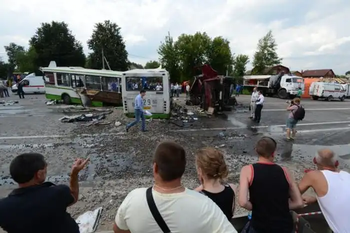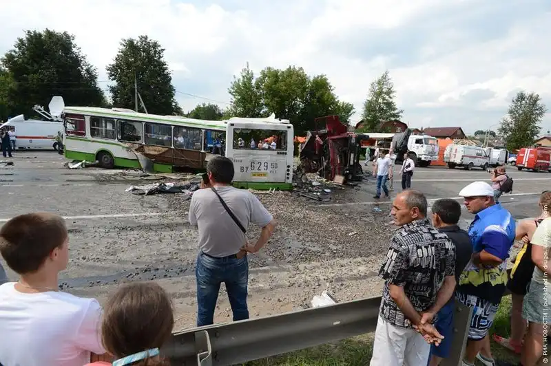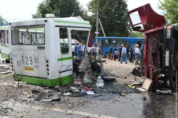 В нескольких километрах от Подольска КамАЗ протаранил пассажирский автобус, битком набитый людьми. По последним данным, погибли 18 человек, более 60 пострадали. Водитель грузовика выжил, как выяснилось, в этом году он шесть раз нарушал ПДД. Очевидцы сообщают, что в этом месте грузовики часто на большой скорости выезжают на встречную, чтобы миновать пробку.