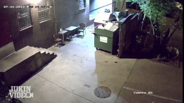 Большой бурый мишка был заснят на камеру, когда нагло крал мусорный бак из переулка