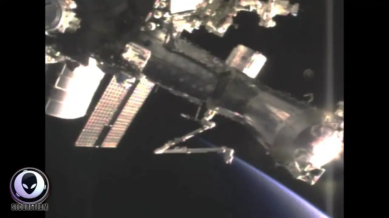 Огромный летающий объект длительно время приближался к МКС, а затем внезапно исчез. Спустя некоторое время «тарелка» снова возникает в левом углу от первоначальной точки и улетает от станции.