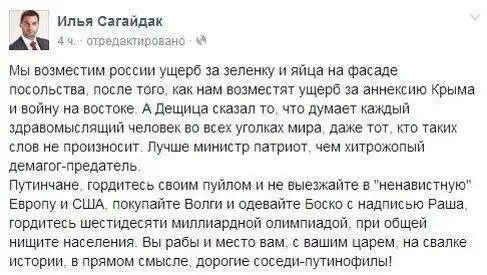 Сразу видно кто у власти сейчас на украине - быдло и мразь. Ладно тупая молодежь кричит всякий бред, но госслужащий ни должен опускаться до такого уровня.!
