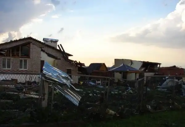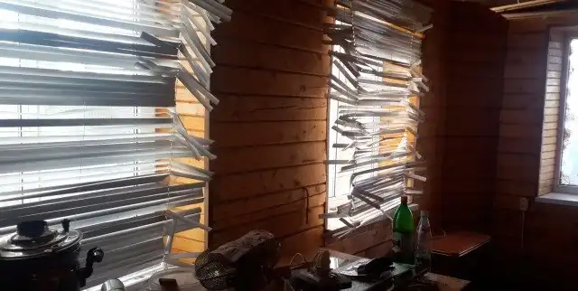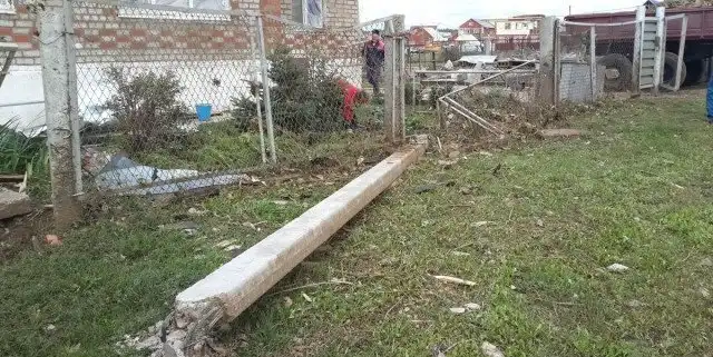 кусок ДВП впился в рабицу. с такой силой может и голову оторвать.