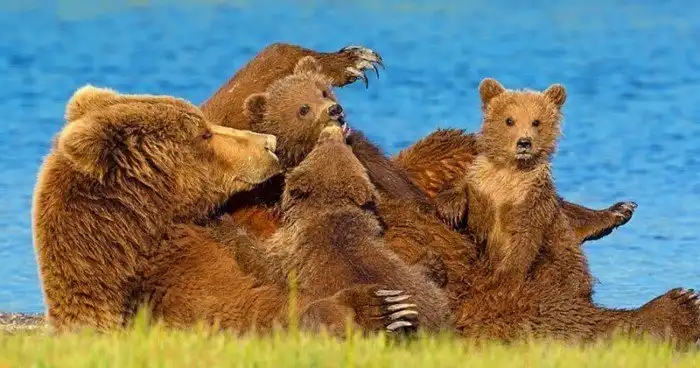 "Бегите! Бегите быстрее!", — кричит один из туристов в Йеллоустоунском национальном парке. Увидев людей, семья медведей решила бежать за ними. Похоже, что туристы очень испугались.