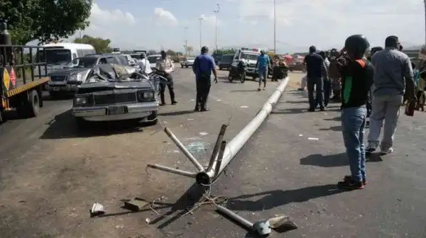 Три человека получили травмы различной степени тяжести в результате действий рабочих, опрокинувших столб на автомобиль неподалеку от Барселоны, расположенной в венесуэльском штате Ансоатеги.Около 09:00 утра сотрудники строительной компании проводили ремонтные работы на шоссе. Как позже выяснилось, они не перекрыли движение по дороге и нарушили технологию демонтажа мачты освещения, в результате чего металлический столб рухнул поперек проезжей части. К несчастью, он упал на проезжавший мимо Chevrolet Malibu. Тяжелая конструкция ударила почти в самую середину крыши, замяв ее внутрь, после чего откатилась на несколько метров в сторону.