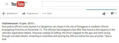 Четыре полицейских были ранены в опасной погони автомобиль в городе Дунгуань в южной китайской провинции Гуандун на 12 декабря Офицеры остановили такси после они нашли несоответствие в регистрационных данных автомобиля. Однако, вместо того, прекращение, водитель нажал на газ и поехал гонки через переполненные улицы, разбив мотоцикл и ранив офицеров, прежде чем он был арестован.