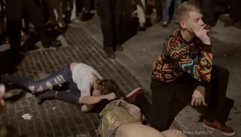Пьяненькие девушки что-то не поделили на улице Остина, штат Техас. Дальше быстрая и жесткая девичья драка, да под восхищенные вопли пьяной толпы. Всё веселье испортили копы, которые быстро разняли дерущихся и надели наручники на самых буйных.