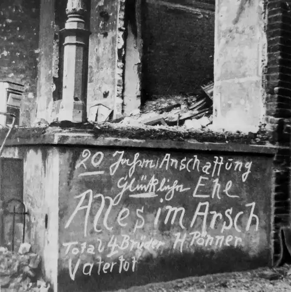 Надпись на стене разрушенного бомбами дома в Кельне. В«20 лет приобретений - счастливый брак — ВСЁ абсолютно В Ж... — 4 брата, отец мертвы