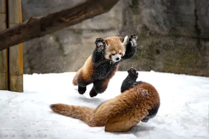 Красные панды на снегу.