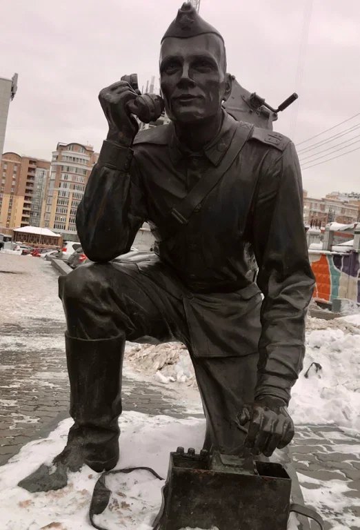 Городская малая архитектурная форма-Военному связисту.За скульптурой дом, на месте казармы полка связи.Самая скульптура у офиса (9 этажей) сотовой компании Мотив.Урал,Тюмень,Оренбург,пермяки.
