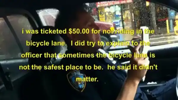 Парня оштрафовали на $50 за то, что он ехал не по велосипедной дорожке. В знак протеста он стал ездить именно по ней, не смотря на паркующихся и препятствия.