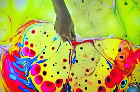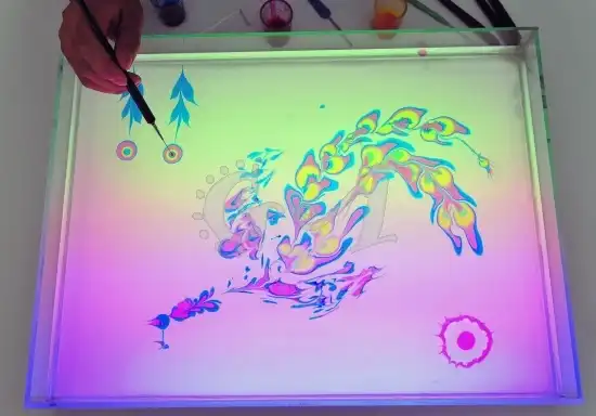 Далее в эту смесь добавляют натуральные краски, которые не растворяются в воде, а остаются на её поверхности, смешиваются между собой и образуют причудливые и неповторимые узоры.