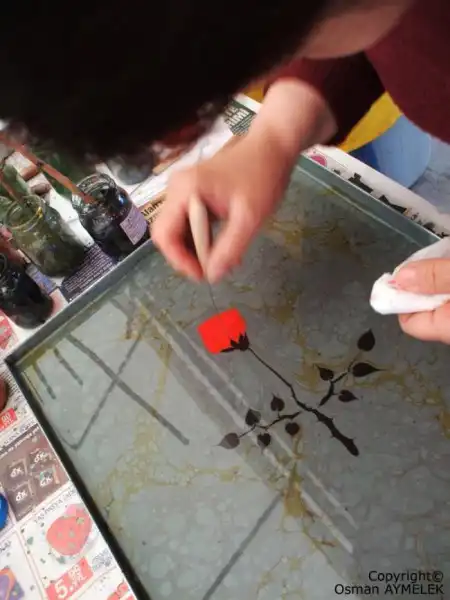 На первом этапе в небольшое прямоугольное корыто выливается специально приготовленный густой раствор из воды и имеющего слабые клеящие свойства нектара гевена (это растение из рода астрагалов растет только в Турции). Таким образом достигается необходимая вязкость воды.