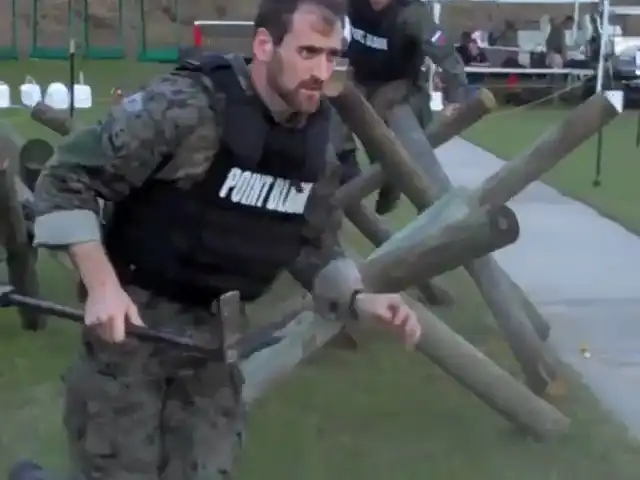 Снайпер и четыре штурмовика по команде подбегают к траверсу, над водой преодолевают препятствие с помощью роликов, затем стену или трубу, подбегают к огневой позиции и, надев противогазы, открывают огонь из автоматов по бумажным мишеням с дистанции 15-20 метров, правда, на соревнованиях все считали в ярдах. Четыре выстрела в зону поражения.