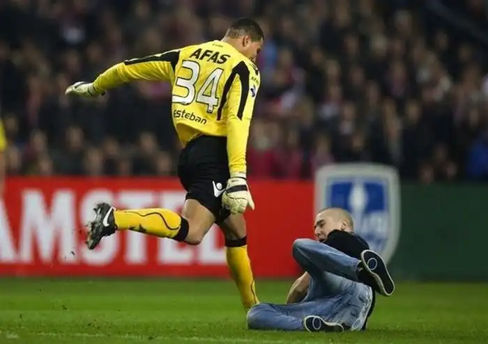 Вратарь голландского футбольного клуба АЗ Эстебан несколько раз ударил ногой болельщика "Аякса", который выбежал на поле во время матча этих команд. Болельщик попытался прыгнуть на Эстебана, но голкипер опрокинул его на землю и дважды ударил ногой, после чего в конфликт вмешались судьи.