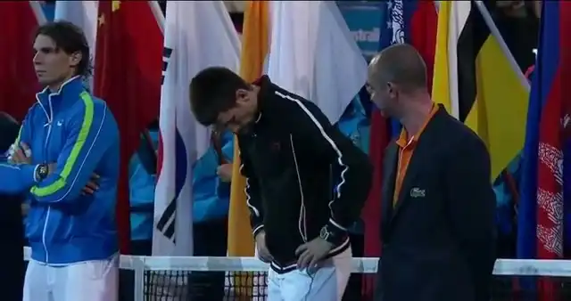 После шести часов изнурительного тенниса , спортсмены слушают торжественную речь, но видно, что им все происходящее не по душе...