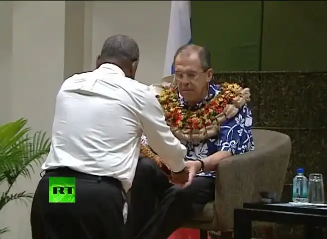 Глава МИД РФ Сергей Лавров прибыл с визитом на Фиджи, где по этому случаю прошла традиционная церемония встречи самых дорогих гостей. Министра облачили в традиционную ярко-синюю рубашки с белыми узорами и ожерелья. В течение 40 минут участники церемонии исполняли традиционные песни, приветствуя высокого гостя. Затем Сергею Лаврову преподнесли ритуальную чашу с соком из корней кустарника кава-кава, распространенного в Меланезии. Глава МИД Росси поблагодарил присутствующих за "колоритный ритуал".