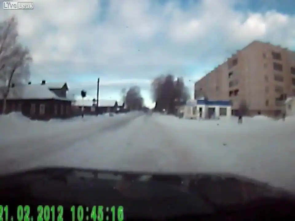 Россия. Февраль 2012 г. Машина сбила женщину и потащила ее дальше по скользкой дороге, пока не врезалась в идущий навстречу автомобиль. Несмотря на то, что женщина буквально оказалась зажата между двумя автомобилями, она уцелела и заработала лишь сотрясение мозга.
