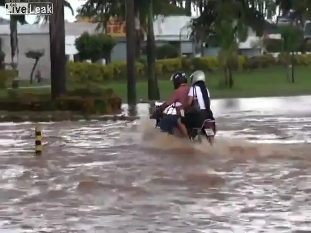 Во время наводнения мотоциклист наехал на открытый канализационный люк.