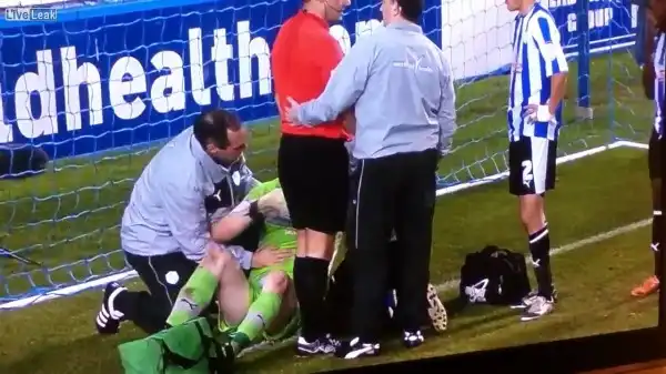 Футбольный фанат, выбежавший на поле и ударил в лицо голкипера одной из команд.