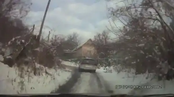 Девушка за рулем старенького универсала не смогла справиться с управлением, пытаясь покорить довольно высокую замерзшую гору. Она покатилась назад, прямо на автомобиль автора видео, в автомобиле которого был установлен регистратор.