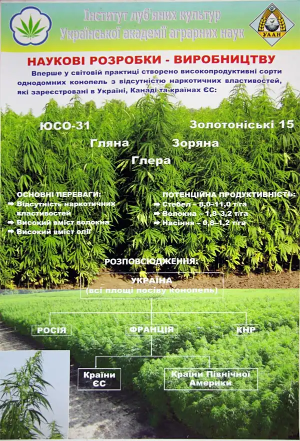 Именно в этом институте созданы высокопродуктивные сорта конопли не обладающие наркотическими свойствами и которые сегодня свободно выращиваются во всем мире как техническая культура.
