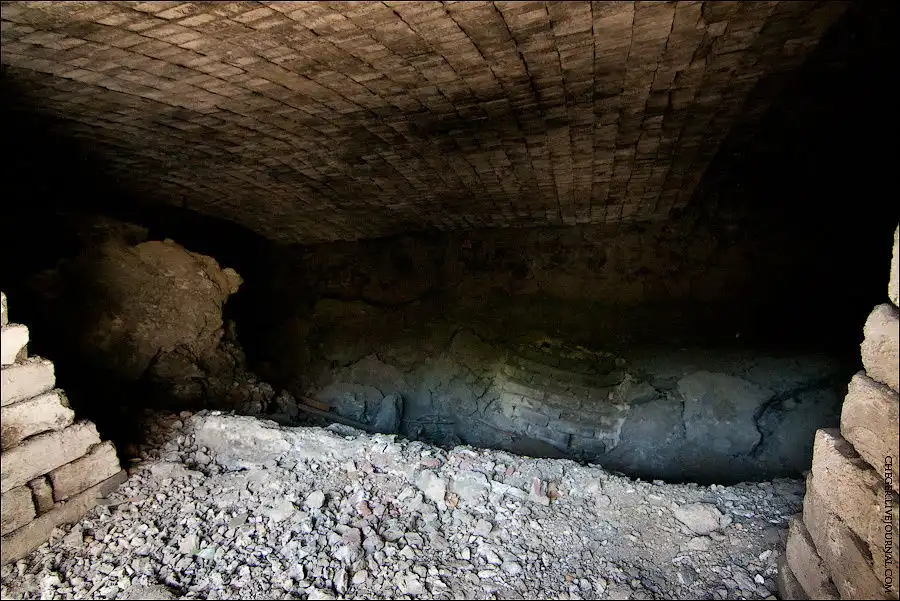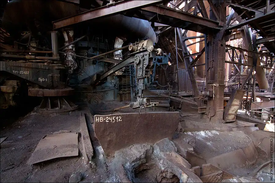 Металл выплавляли в домне. Ее форма напоминает перевернутую бутылку. Здесь температура могла доходить до двух тысяч градусов. Самый верхний слой - шлак - удаляли, металл разливали по емкостям. Домны самой первой постройки на заводе не осталось. Ее стенки быстро прогорали, печь приходилось часто ремонтировать. Это домна образца 1955 года. Расхитители музея и до нее добрались.