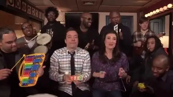 Состав передачи Late Night with Jimmy Fallon исполняет песню из мультфильма "Frozen" вместе с актрисой, озвучившей Эльзу.