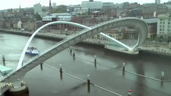 Пешеходно-велосипедный мост Миллениум через реку Тайн и соединяющий британские города Гейтсхед и Ньюкасл-апон-Тайн, на днях преподнес сюрприз. Первый в мире наклоняемый мост, бесперебойно выполнявший свои функции с момента открытия в 2002 году, вдруг застрял в воздухе.Механизм застопорился около 13:30, после того как мост поднялся, чтобы пропустить курсирующие по реке корабли. Это очень озадачило многих пешеходов и велосипедистов из пригородной зоны, которые не спеша добирались на работу по самому удобному и привычному пути.