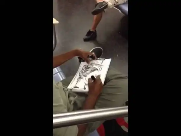 Скромный и талантливый темнокожий художник быстро и эффектно нарисовал всех пассажиров вагона электропоезда.