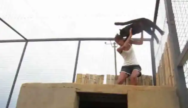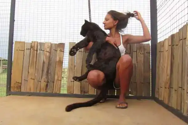 Сначала у зрителей складывается впечатление, что большая черная кошка с едва заметными на шерсти пятнами собирается наброситься на беззащитного человека, однако через мгновение становится понятно — животное просто приветствует свою любимицу, пишет Mirror.